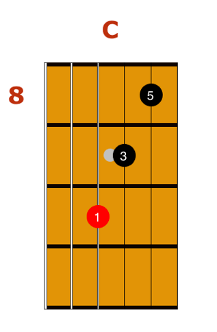 A Triad is created using a scale, and taking the 1st, 3rd, and 5th interval. The triad above is a C Major Triad, consisting of the intervals C, E, G. You can use this same formula with any major chord. For example, using the root note F, we can determine that the third is A, and the fifth is C. All you have to do afterwards, is find those notes on the fretboard and you have successfully created a triad.